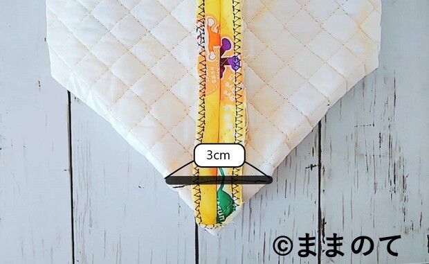 両端を縫ったら縫い目が中央になるように布を折り、アイロンで形を整えます。マチが3cm程度になるよう布に印を付け、縫います。