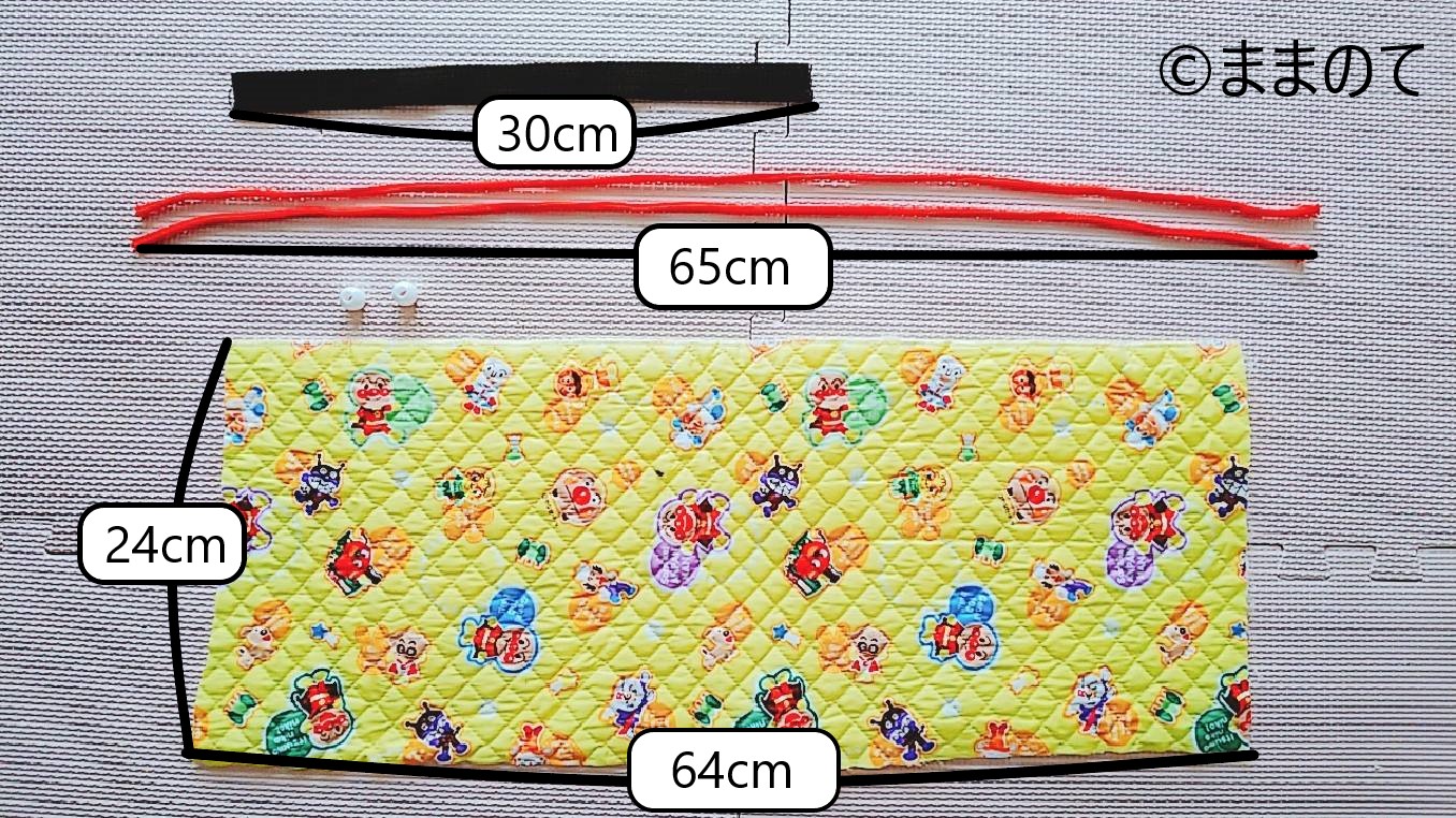 縫い代の部分を入れた長さを測り、布を裁ちます。左右の縫い代を1cm、紐通し口を7cm程度みておくと良いでしょう。25cm程度の上履き入れを作る場合、64×24cmの布を使うとちょうど良い大きさに仕上がります。