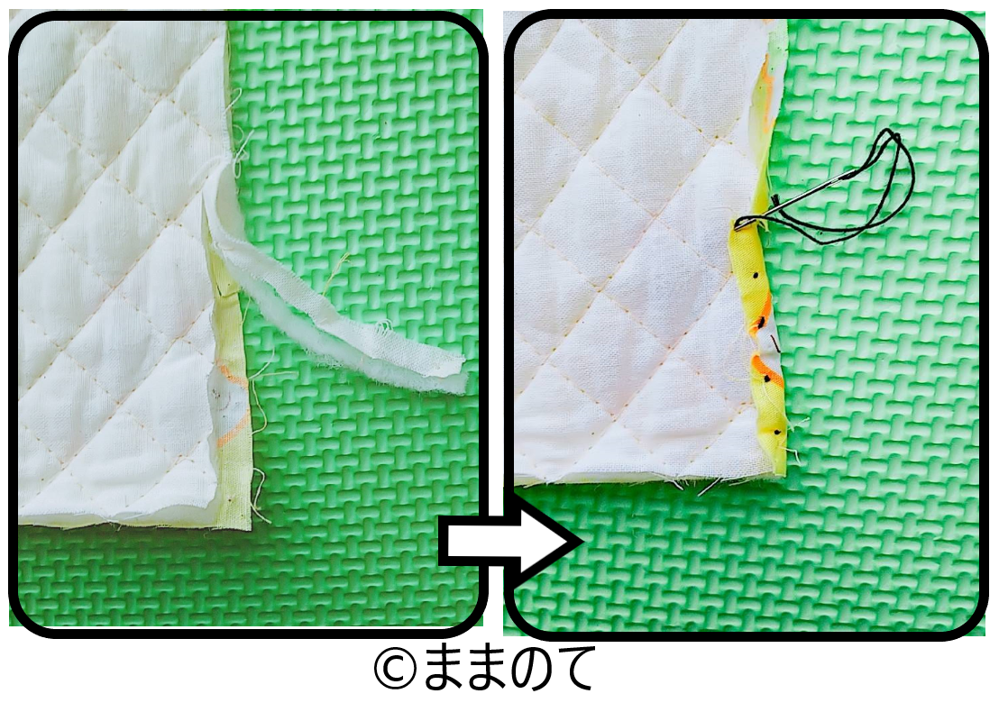 手縫いの場合はキルティングの裏の布と綿をカットし、表の布をかぶせるように縫い合わせます。かぶせた布の後ろから前に糸を出すように縫い、玉止めは布の内側に収めましょう。