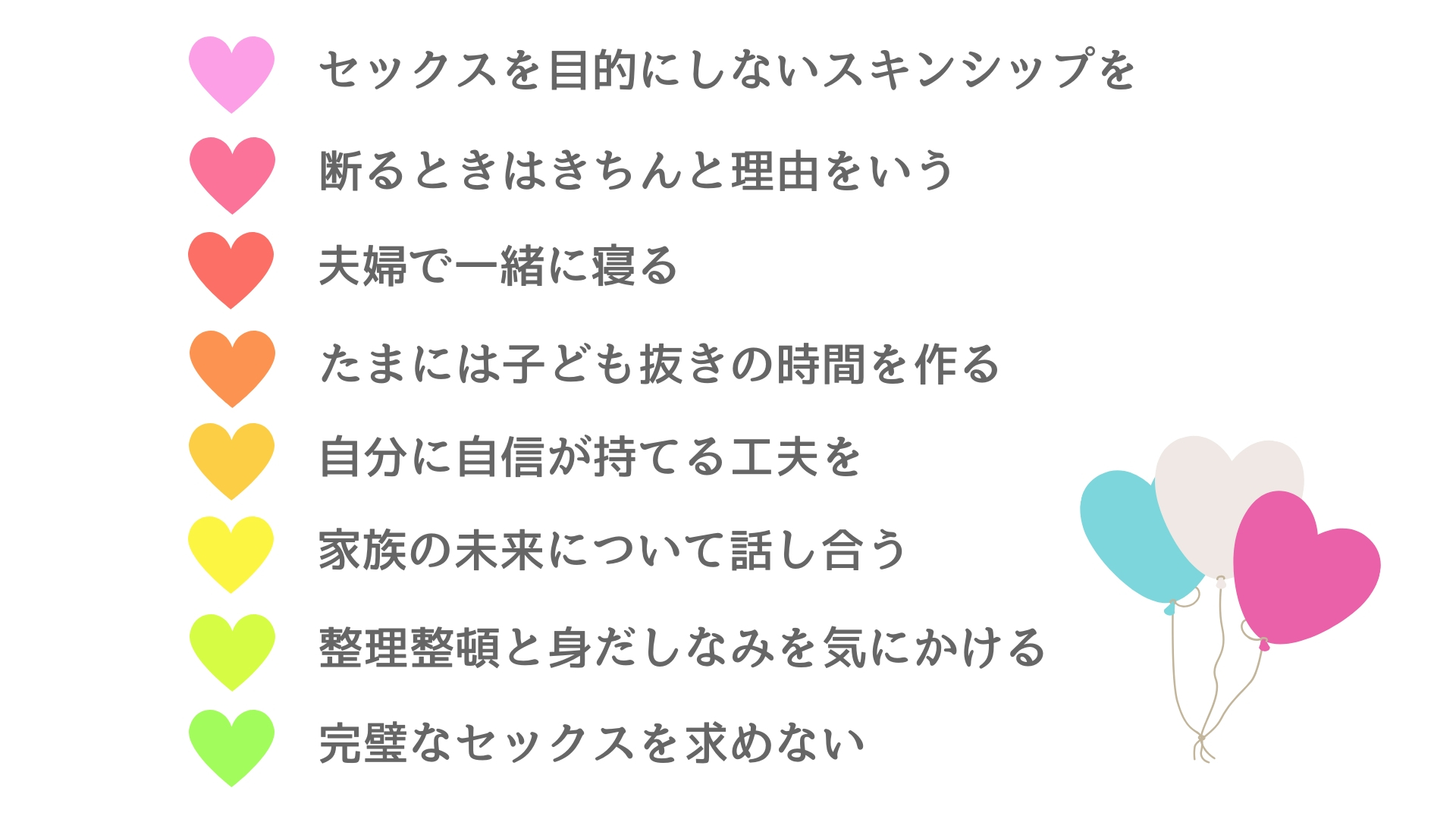 セックスは夫婦の絆を深める行為であるのはもちろん、新しい家族を迎え入れるために必要な行為です。子どもができる可能性がセックスの先にある以上、今後の仕事や子どもの教育に関する考え方をすり合わせておくことが大切です。心配を取り除いて、セックスを前向きにとらえられると良いですね。