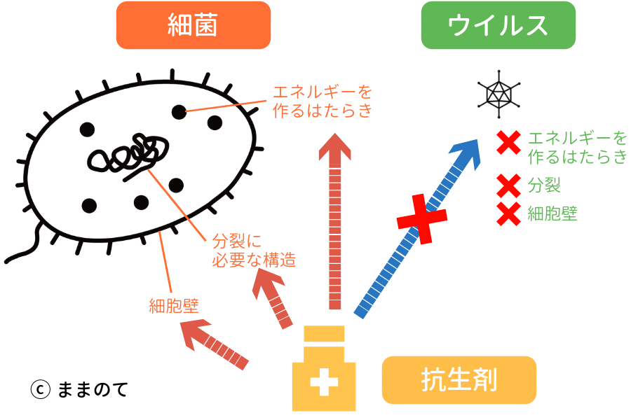 抗生剤はこの壁(細胞壁)を壊したり、エネルギーを作れなくしたり、細胞分裂できなくしたりすることで細菌をやっつけていきます。一方でウイルスには細胞壁や細胞分裂する機能がないため、効果がありません。たとえば、アンパンマンに水をかけると力が出なくなりますが、バイキンマンに水をかけても何も起こらないのと同様です。ウイルスの感染に抗生剤は効果がないので、風邪に薬を使ったからといって早く治るわけではありません。