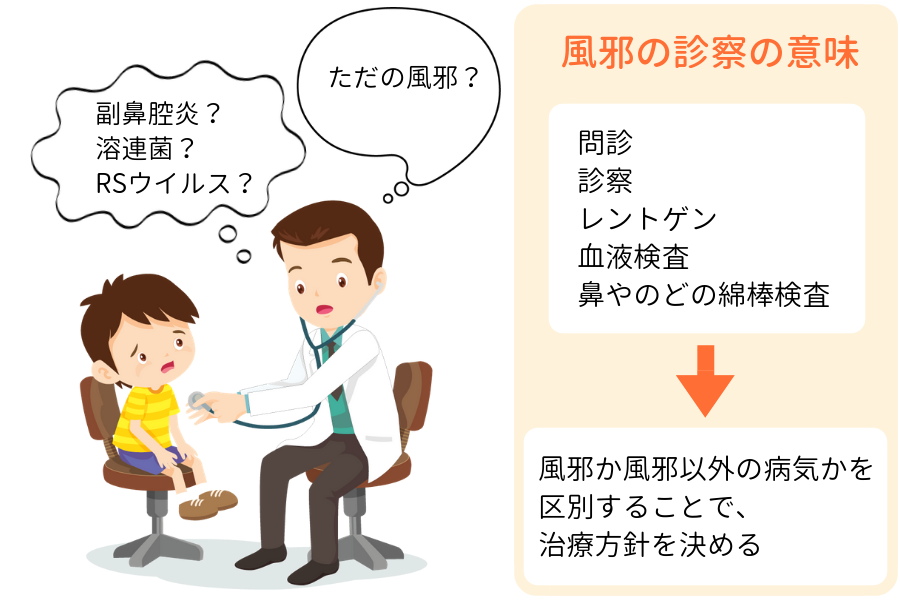 風邪か風邪以外を区別することで、様子を見て良いのか、特別な治療が必要なのかがわかります。小児科を受診すると早く治るお薬を出してもらえるという期待があるかもしれませんが、診断が風邪であれば早く治すお薬はありません。水分をこまめにとり、しっかり睡眠をとることのほうがはるかに重要です。一方風邪以外であれば治療薬が使える場合がありますし、何もしなければさらに悪化する可能性があります。