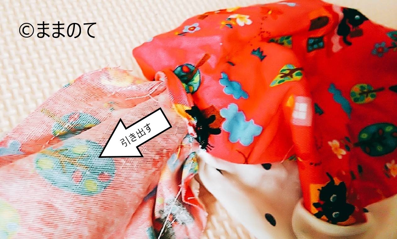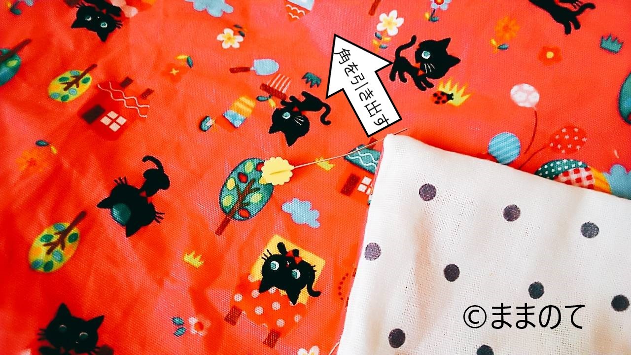 目打ちやまち針を使用し、表面に返したランチマットの四隅を引き出して角を作ります。