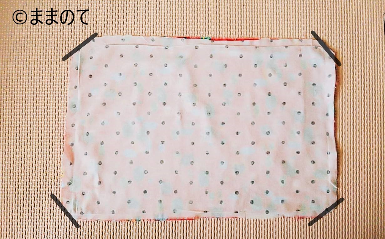 縫い合わせた布をひっくり返したときに端が厚くならないよう、四隅を斜めにカットします。このとき、縫い目を切らないように注意しましょう。