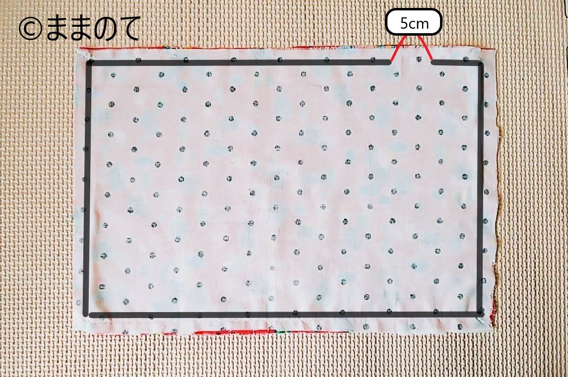 縫い代の部分を考えて長さを測り、布を裁ちます。四隅の縫い代を各1.5cm程度考えておくと安心です。園でサイズが指定されている場合も、指定のサイズに加えて縫い代を測ってから布を裁ちましょう。
