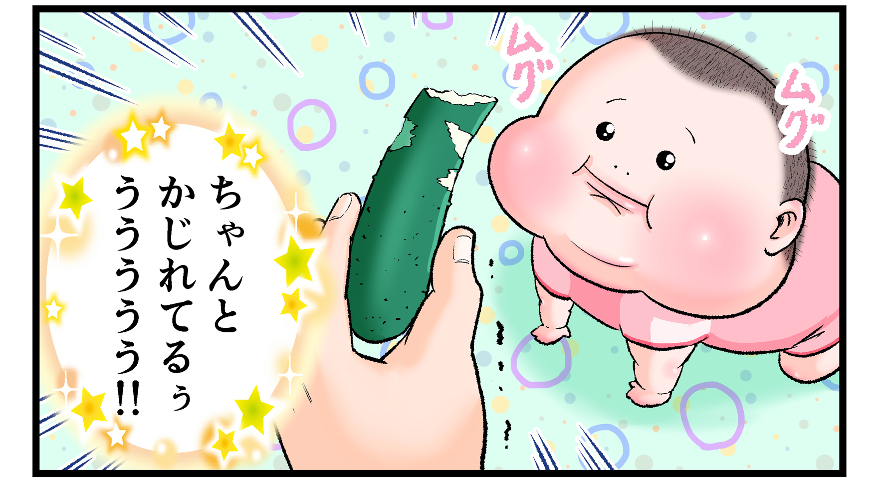 前歯上下2本ずつ生えたころで、もうこんだけかじれるようになったんだと地味に感動しました。(生後8ヶ月頃)
