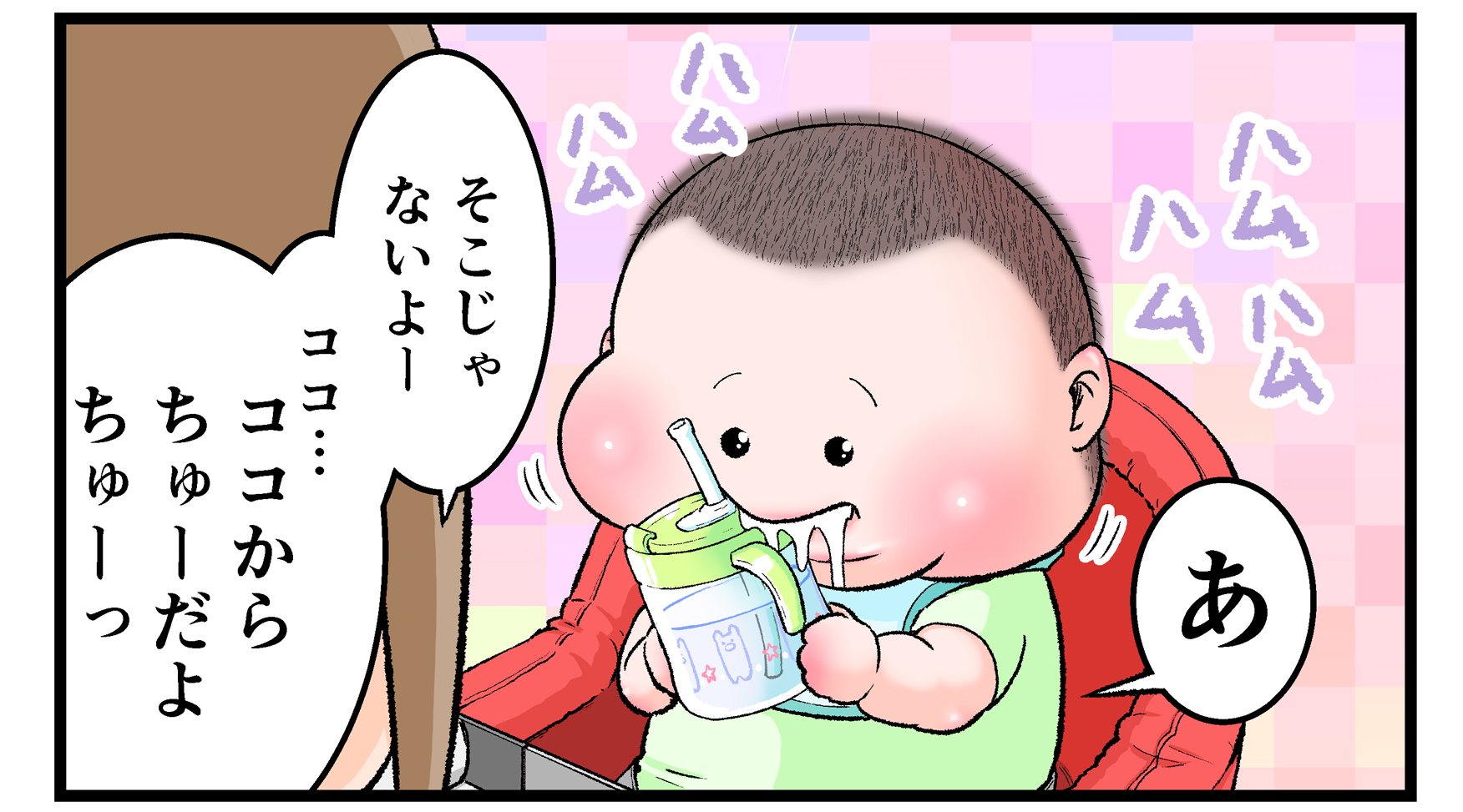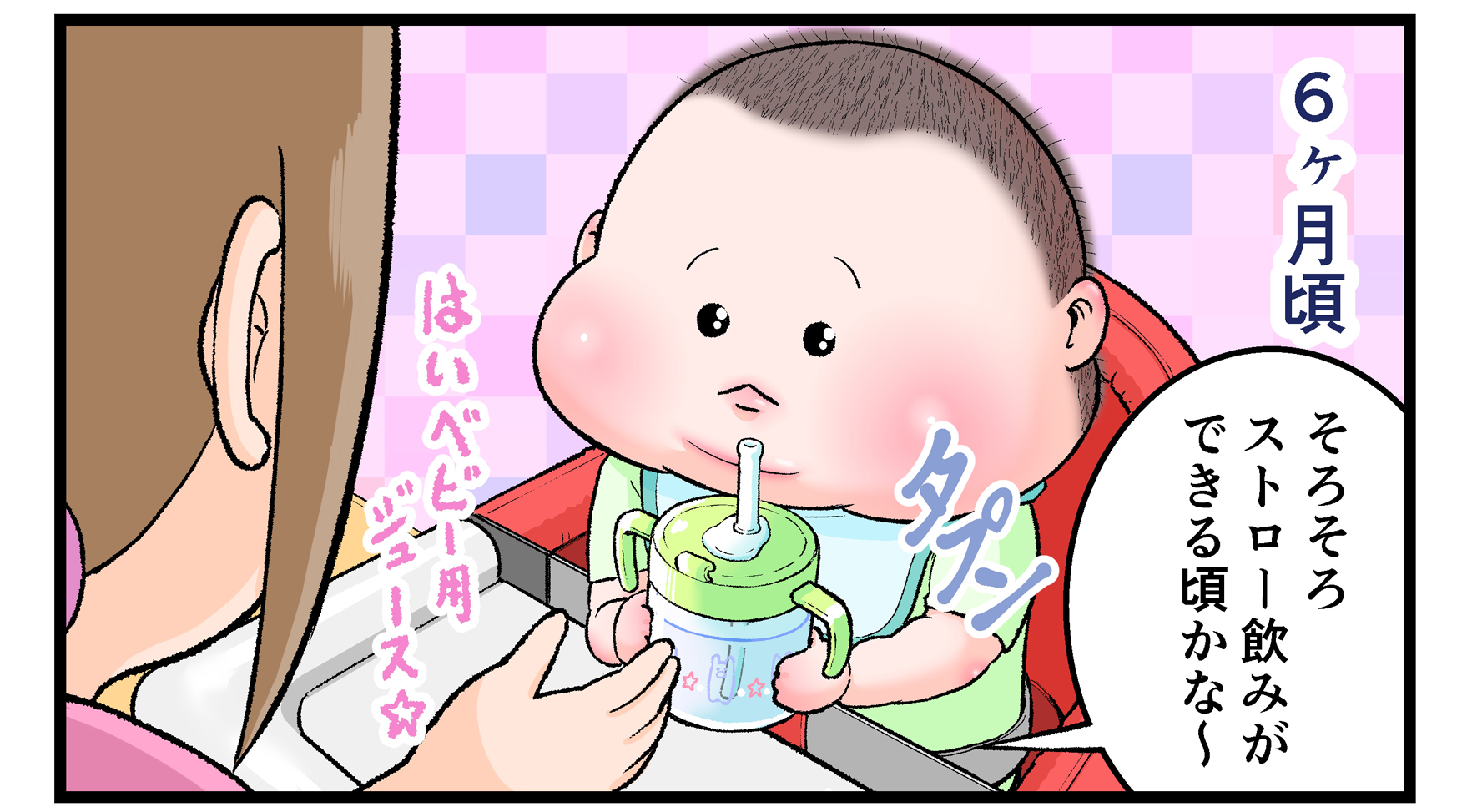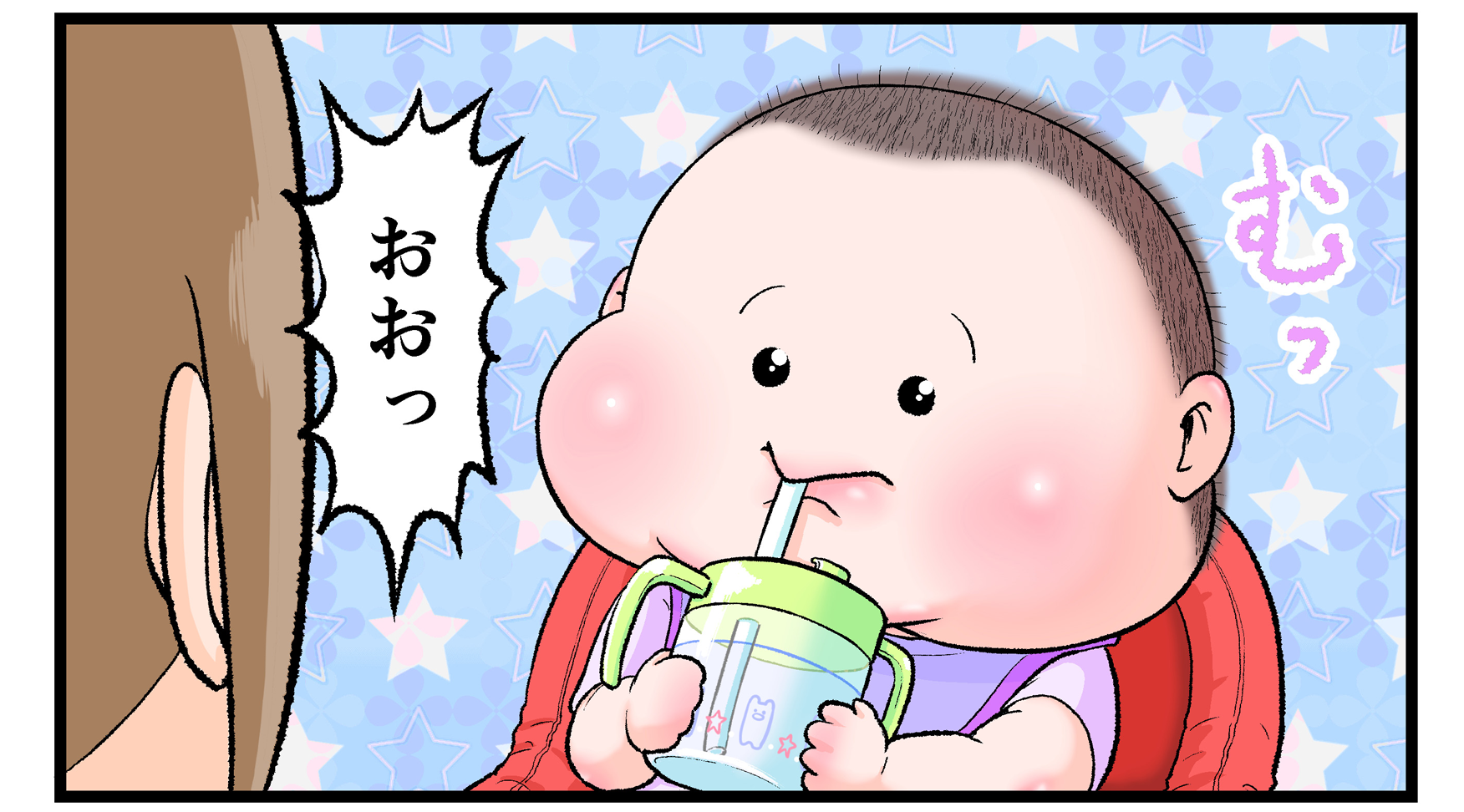 最初は全くといっていいほどストロー飲みができず、1ヶ月ほどあきらめていました。しかし、毎日根気強く続けているうちにちょっとずつ飲めるようになりました。飲めるようになっても、最初はハシビロコウみたいに口から大量にダバアしていました。