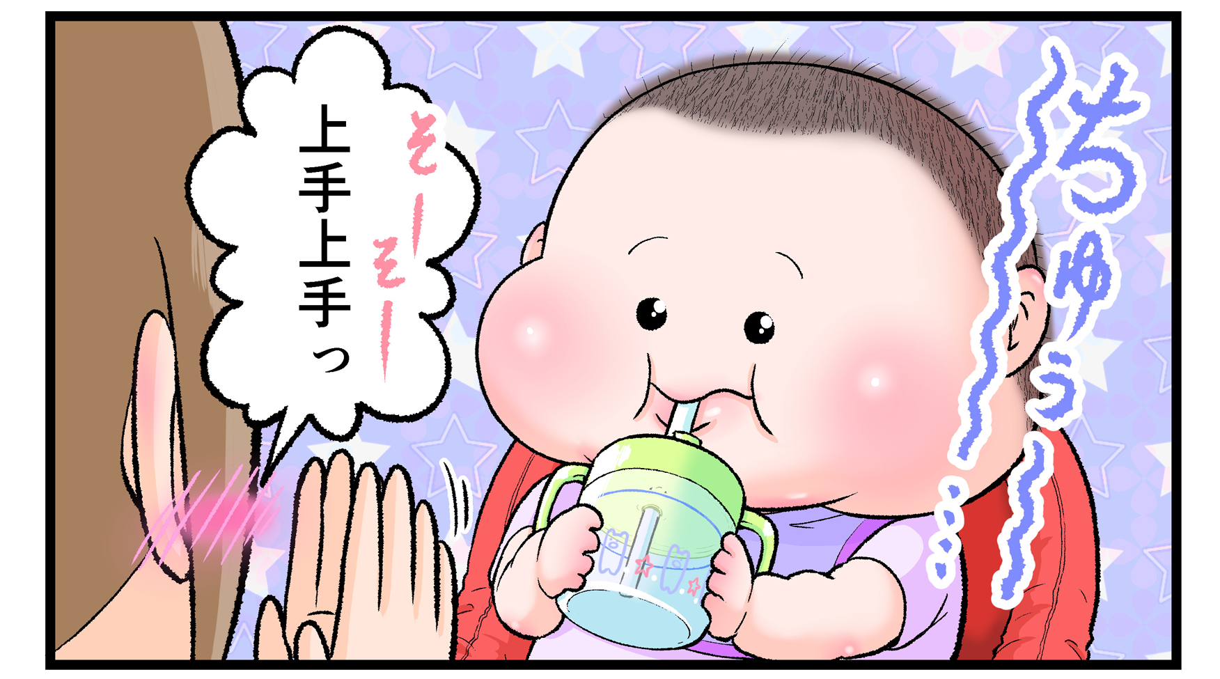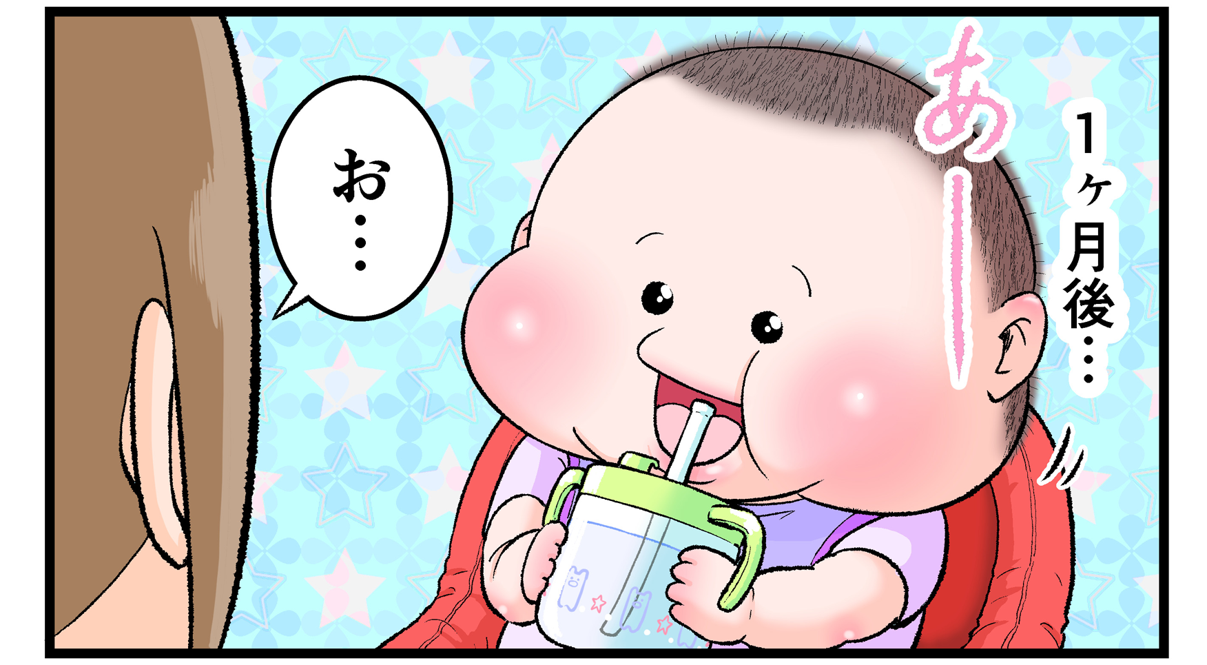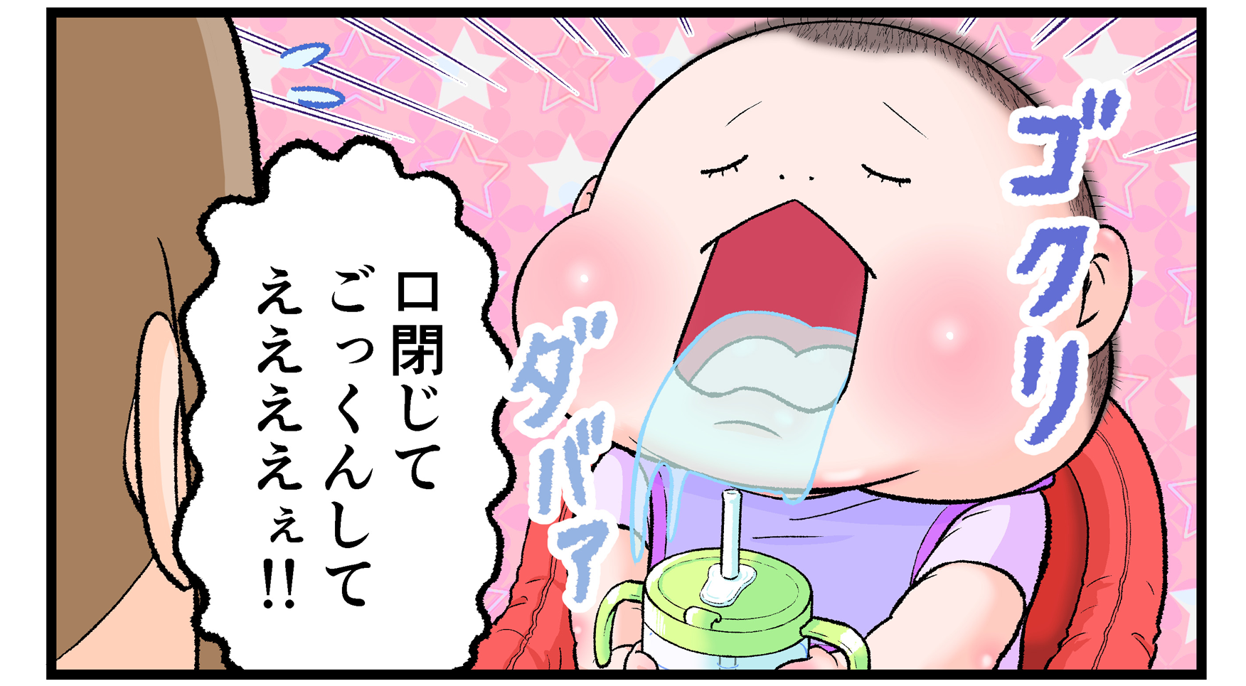 最初は全くといっていいほどストロー飲みができず、1ヶ月ほどあきらめていました。しかし、毎日根気強く続けているうちにちょっとずつ飲めるようになりました。飲めるようになっても、最初はハシビロコウみたいに口から大量にダバアしていました。
