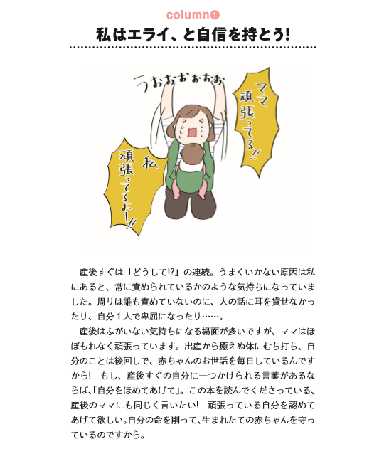 産後はふがいない気持ちになる場面が多いですが、ママはほぼもれなく頑張っています。(中略)もし、産後すぐの自分に一つかけられる言葉があるならば、「自分をほめてあげて」。
