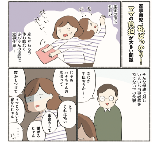 赤ちゃんのために、産後せわしなく働くママとくらべて、なかなかママと同じようには動けないパパたち。オキさんの家ではというと…?