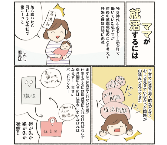 妊娠と同時に退職したオキさん。産後に「働きたい!」と思ったときに次々と立ちはだかる壁について、くわしく描かれています。