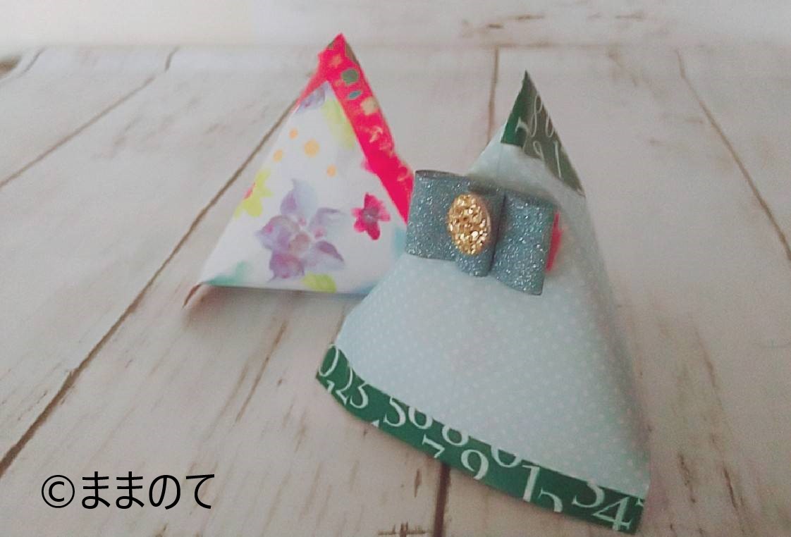 100均のカラフルな包装紙や折り紙を使用し、立体的な三角形を作るラッピングアイデアです。マスキングテープの色やデザイン・太さなどに変化を加えると、見た目の印象が変わってきますよ。