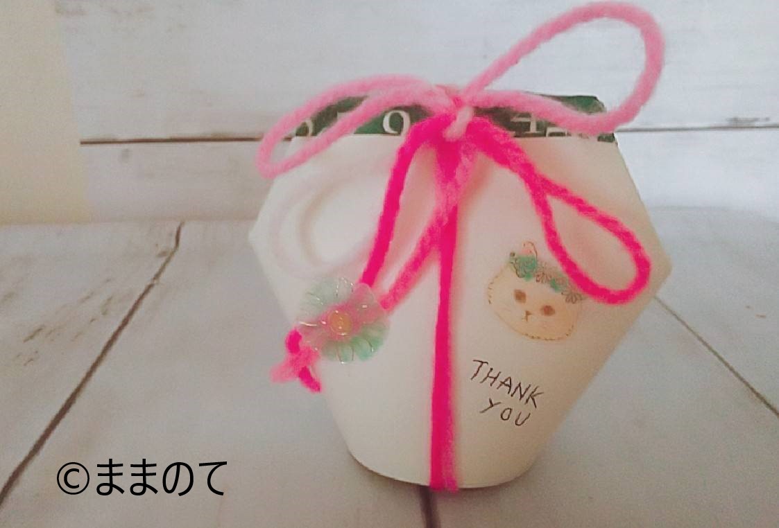 紙コップを使用したラッピングアイデアがです。贈りたいものを紙コップに入れ、コップの口をマスキングテープなどで閉じましょう。おしゃれな紙コップを使用したり、リボンやシールを飾ったりしても良いですね。
