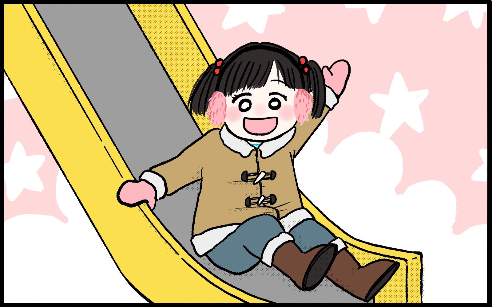 そして高さのある滑り台からすーっと滑り降りると私のほうを見て、