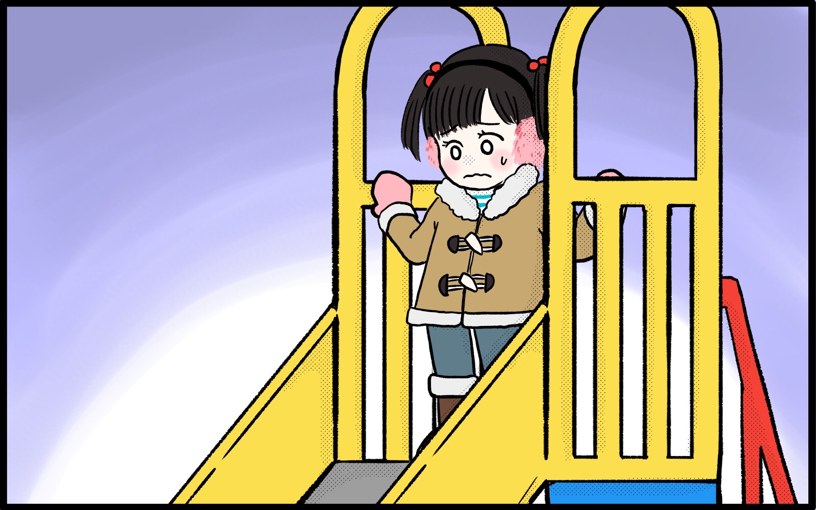そんなサポートをしていると、長女は離れたところにある滑り台のほうに向かいました。この滑り台は比較的高さがあり長女にとって初めてのものです。長女はかなり慎重で怖がりな性格のため、こういった高さのあるもの、初めてのものは苦手です。「こわいー」と言いながら、滑り台の上まで登るものの、滑ることはできず、また階段から下りてくるというのを繰り返していました。