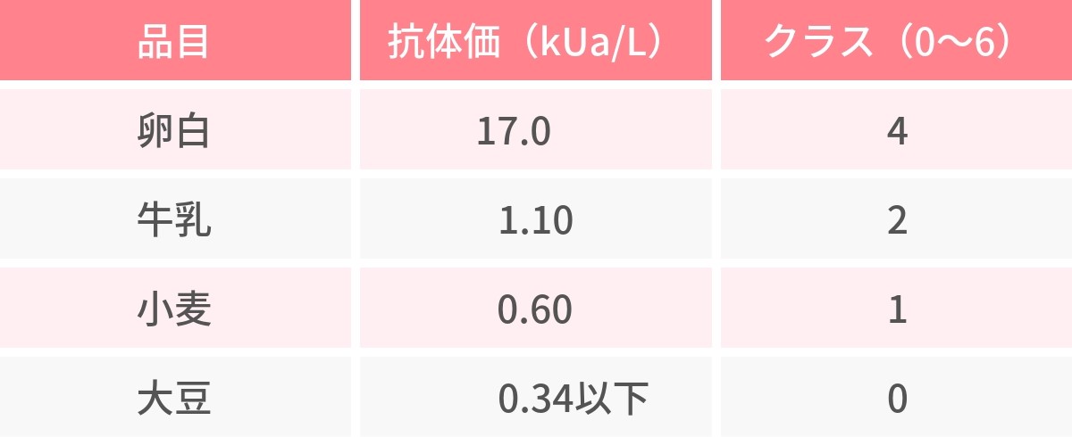 「クラス」というのはアレルギーのレベルのようなものです。抗体価の数値が高いほどクラスの数字が大きくなり、実際に食べてアレルギーの症状が出る可能性が高くなります。