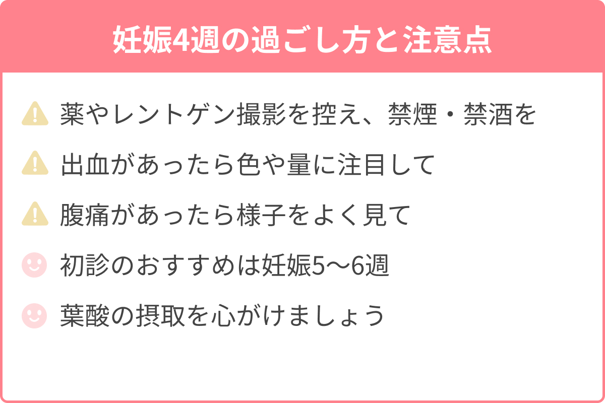 妊娠4週では妊娠が成立しているか判断がつかないことも多くありますが、後で後悔したり不安になったりすることのないように、妊娠している前提で生活をするのが良いでしょう。少しでも妊娠の可能性があるときは以下のことに特に注意をして過ごしてくださいね。