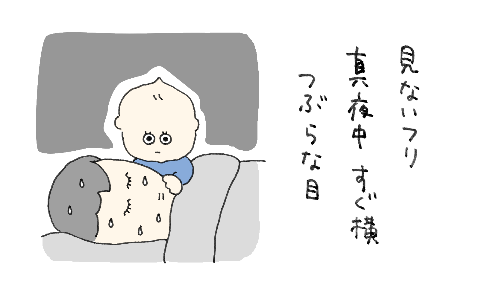夜の授乳を済ませて赤ちゃんを寝かしつけて、やっと訪れたママの睡眠時間。ふと気配に気付いて目をあけると、そこにはお目目をパッチリ明けてこちらを見つめる赤ちゃんの姿が…!そのときのママの気持ちがよく伝わってくる作品です。
