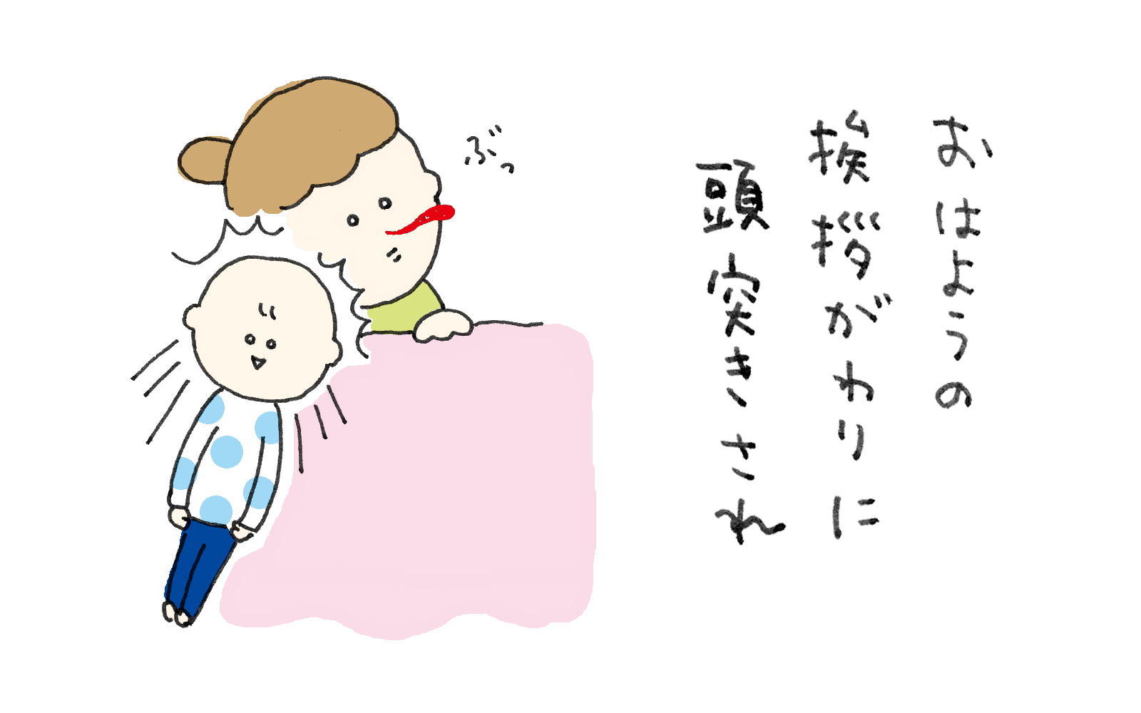 朝早く目をさました赤ちゃんに、頭突きで起こされた体験を持つママやパパは多いのではないでしょうか…?楽しい朝の様子が思い浮かぶ作品です。