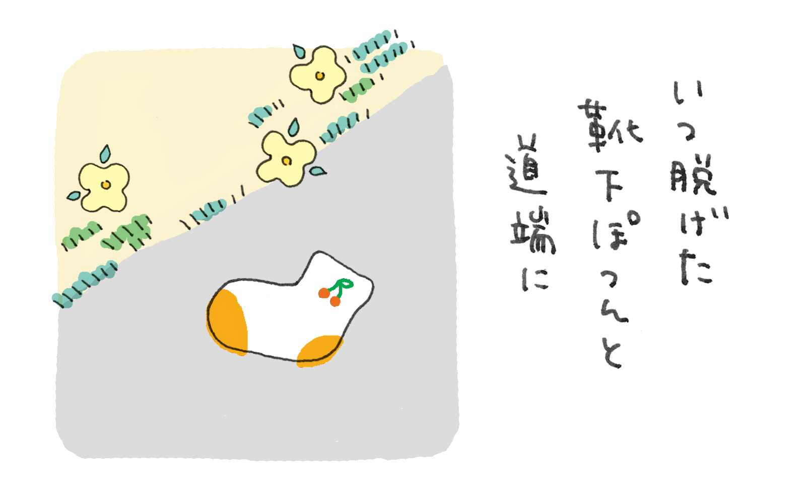 赤ちゃんの靴下は脱げやすいもの。ぽつんと道端に取り残された靴下の情景から、帰宅後に赤ちゃんの靴下がなくなってガッカリしているママやパパの顔を想像させられますね。