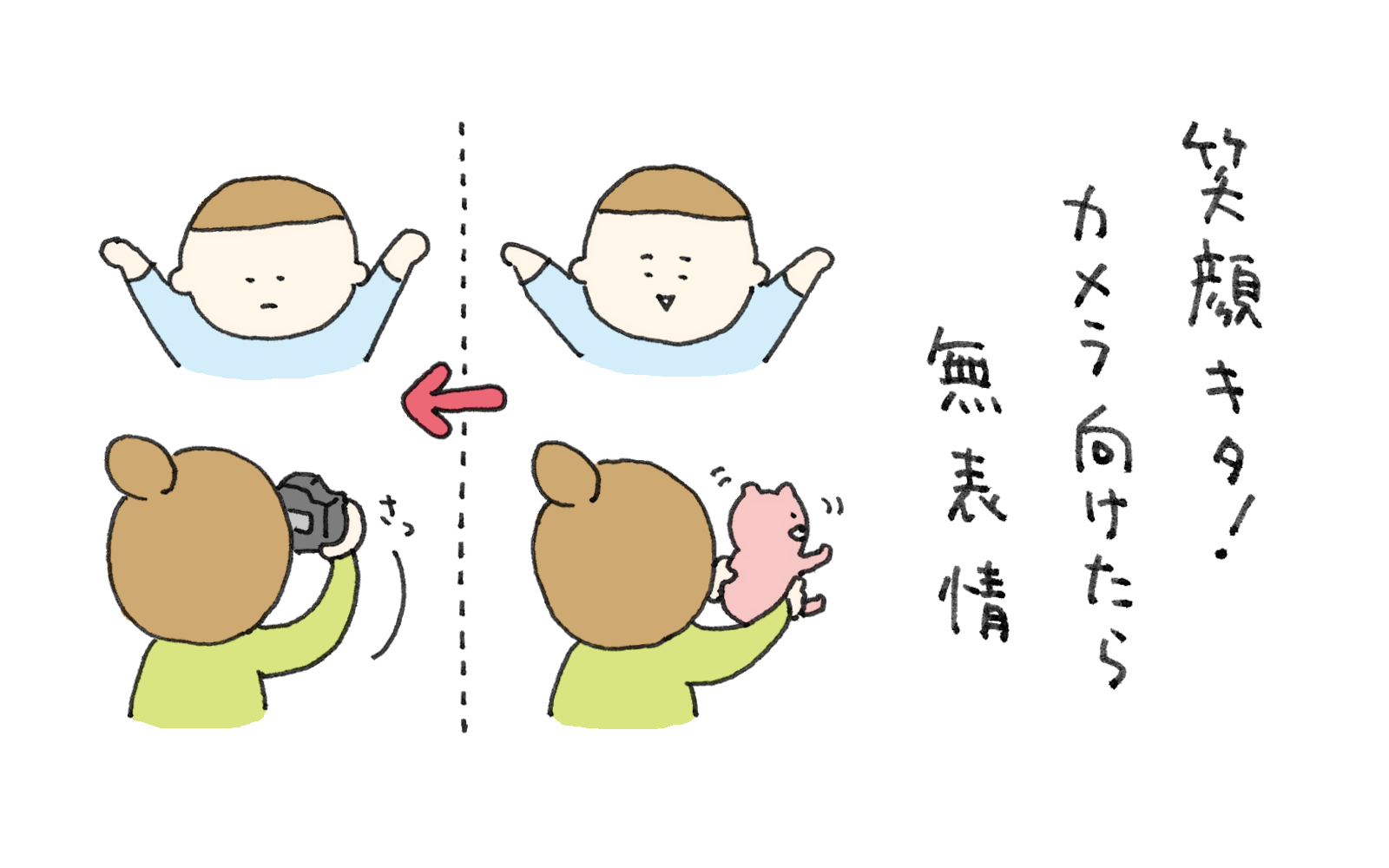 赤ちゃんの笑顔にシャッターチャンスと思ったら、無表情。本当はうちの子、もっとかわいいのに…!そんなママの叫びが聞こえてきそうな作品ですね。
