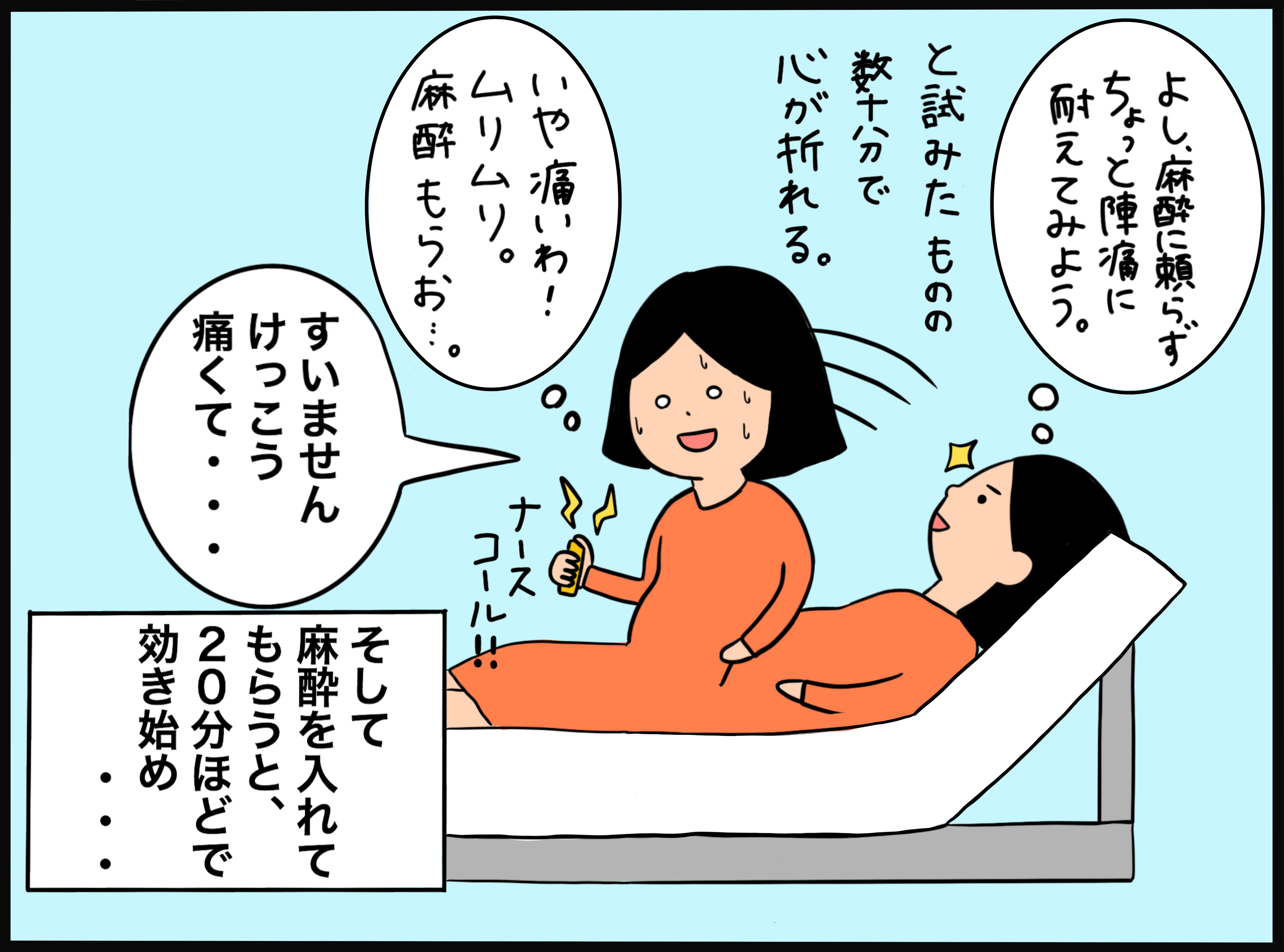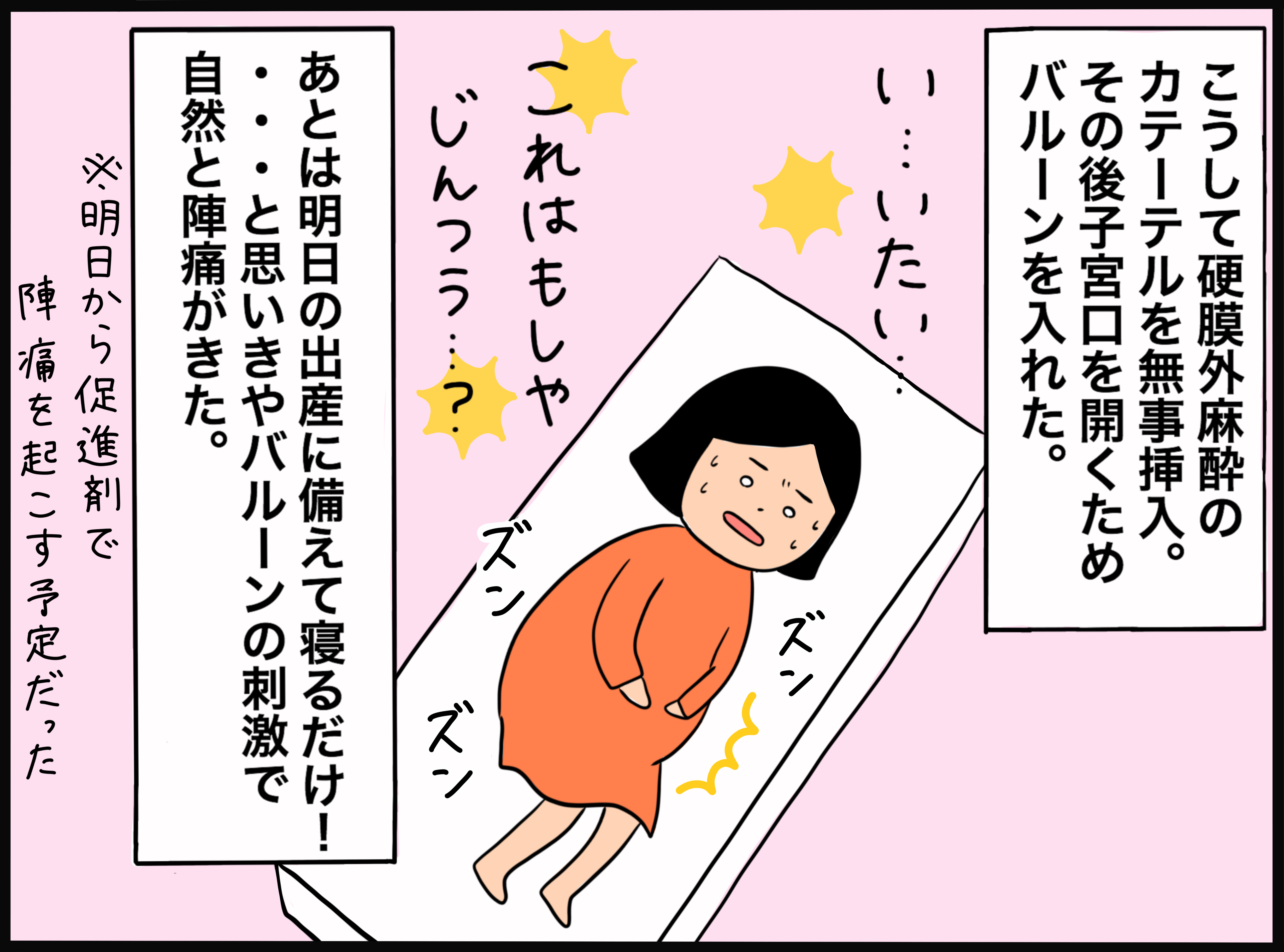 みずじさんの場合は、前日に子宮口にバルーンを入れた刺激で自然と陣痛がきたそうです。麻酔が入ると、まったく痛みを感じなかったといいます。