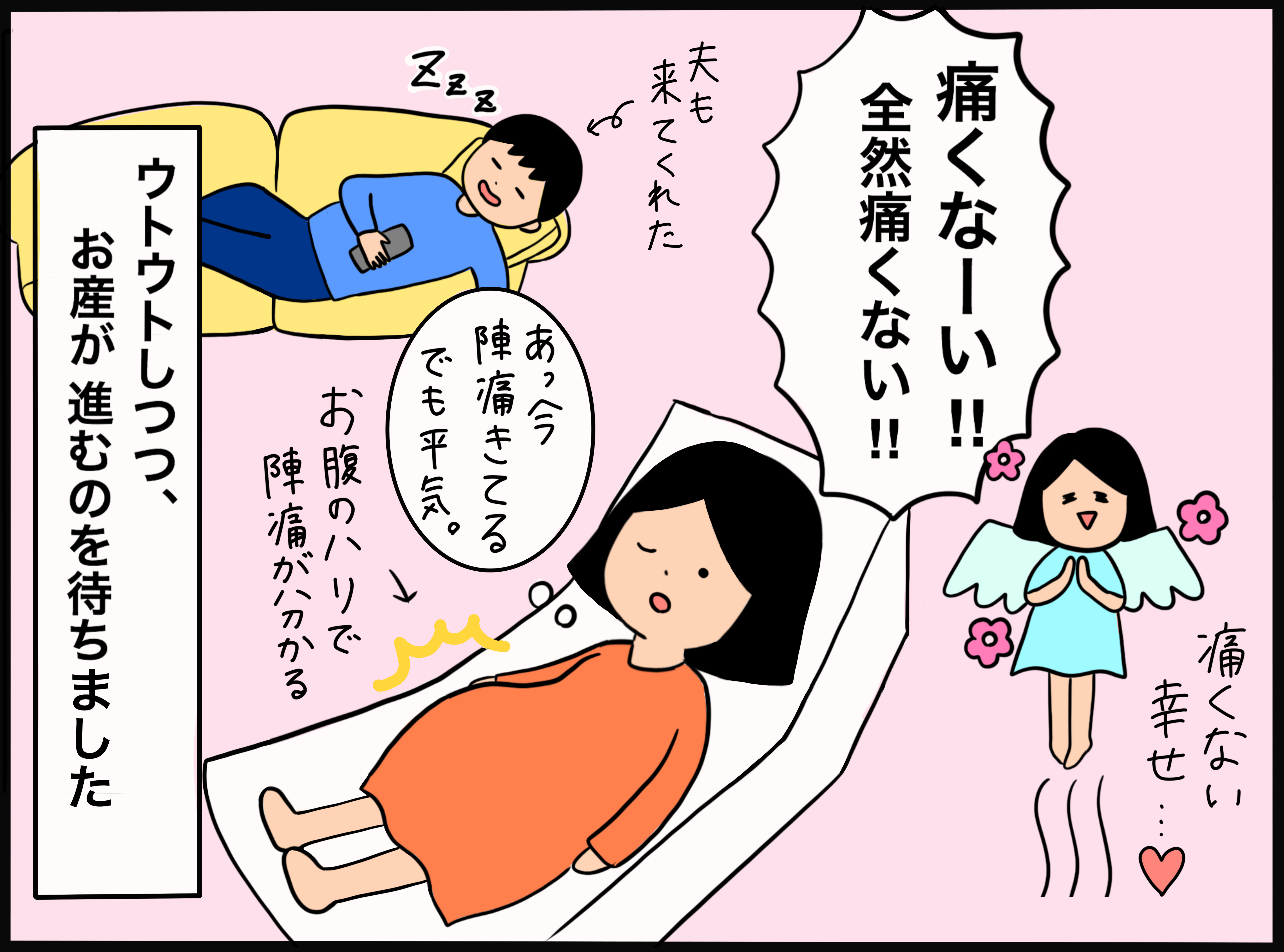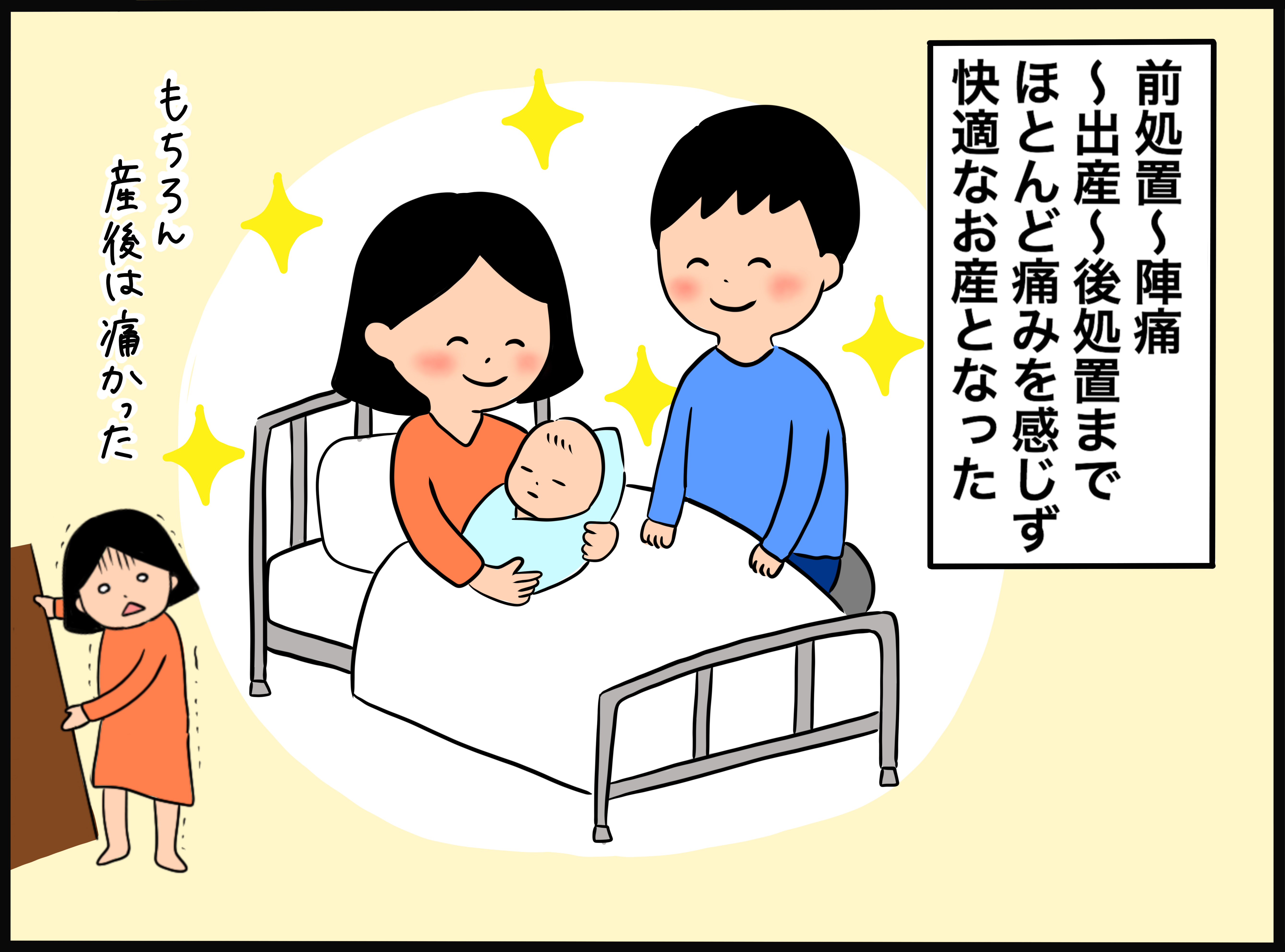 生まれる直前に、あまりに痛そうなのでと麻酔のレベルを上げてくれて少し楽になり、陣痛の合間に助産師さんと話すこともできました。前回は意識がもうろうとして話もできなかったので、痛みがゼロではないにしろ、無痛分娩が断然楽でした。