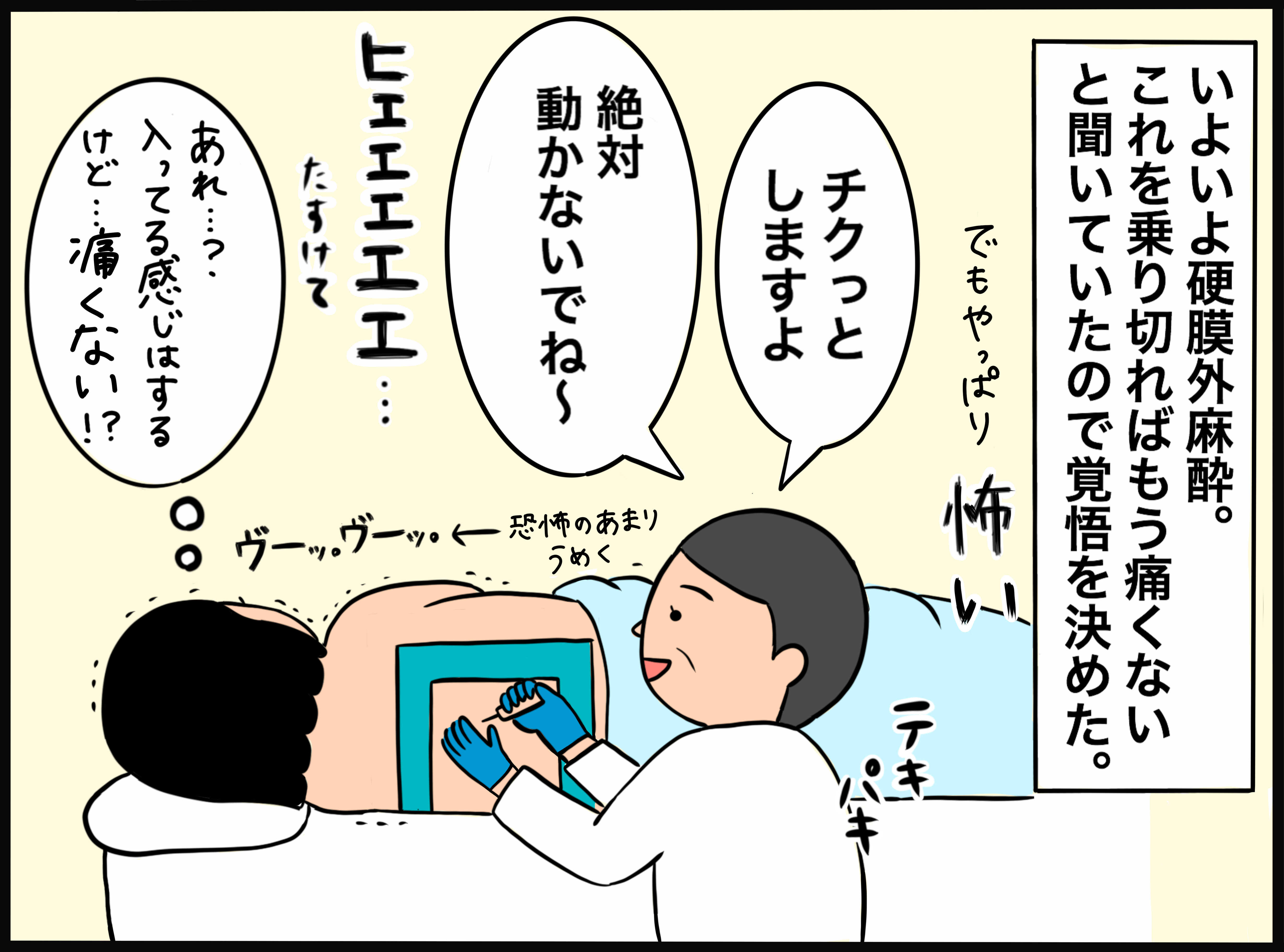 無痛分娩の麻酔は、「硬膜外麻酔(こうまくがいますい)」と「点滴麻酔」の2種類です。みずじさんは、鎮痛効果が高く赤ちゃんへの影響がほとんどない「硬膜外麻酔(こうまくがいますい)」を選択しました。