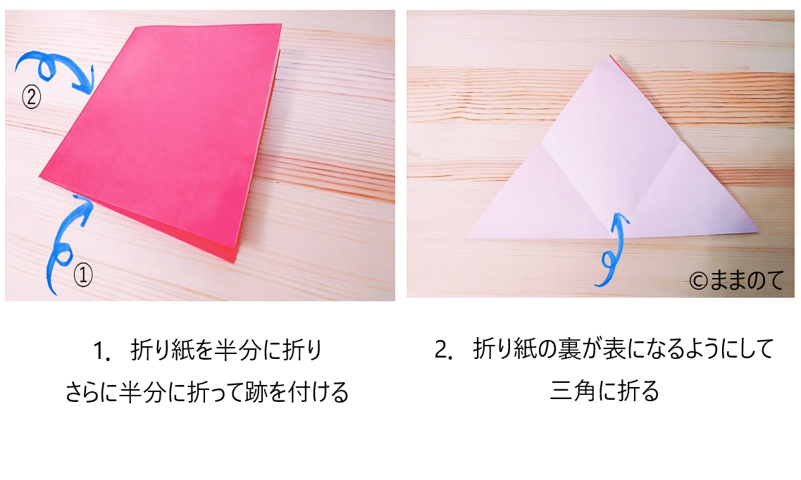 2.折り紙の裏が表になるようにして三角に折る