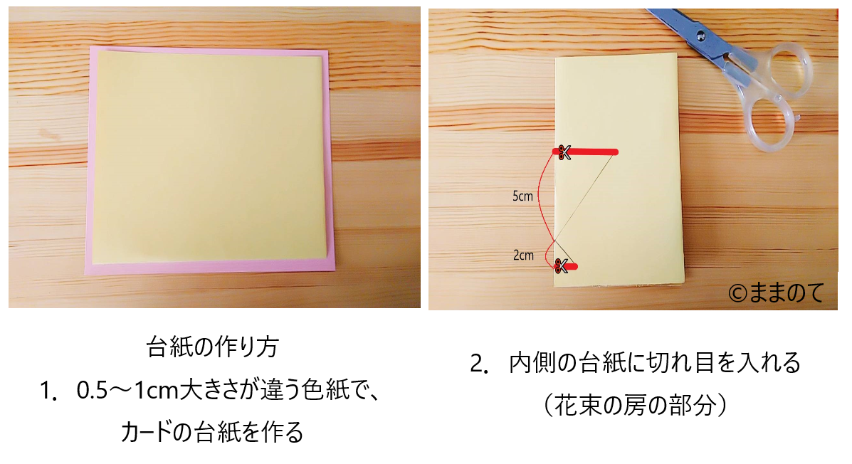1.台紙と切り込みを入れたカード、ペーパーで作った花をのりで貼る