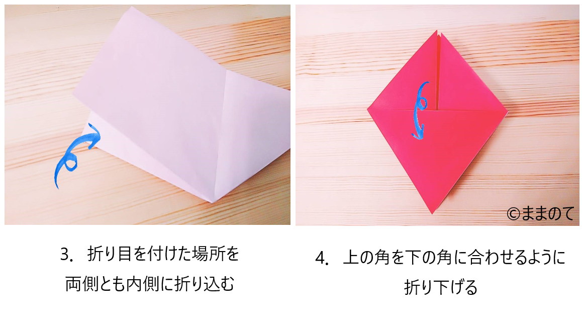 4.上の角を下の角に合わせるように折り下げる
