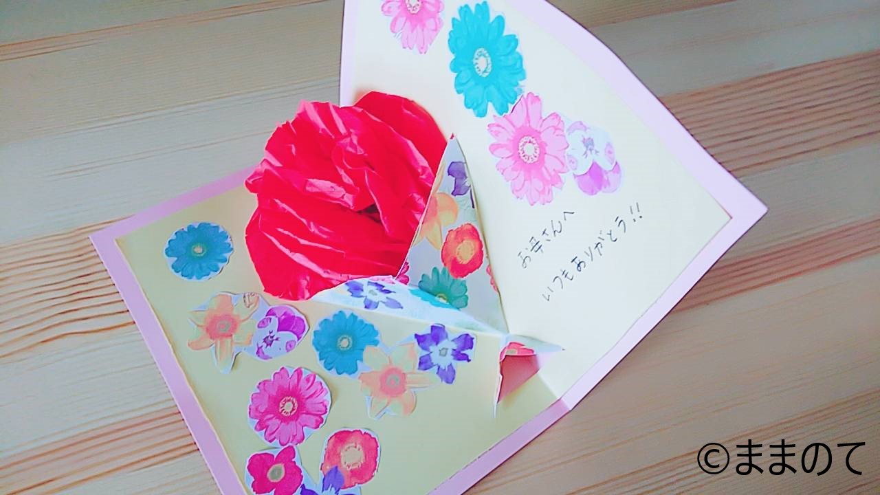 メッセージカードにインパクトを与えたい場合、飛び出すカードがおすすめです。カーネーションなど飛び出すモチーフは、100均の素材で簡単に作ることができますよ。