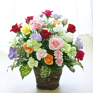 カラフルなミックスカラーのバラと季節の花を使用した生花のフラワーアレンジメントです。華やかさをプラスしたいときは400円でカスミ草が追加できますよ。ワンサイドスタイル(片面見)なので飾る際に向きを選びますが、そのぶん正面から見たときはとてもボリュームがあります。