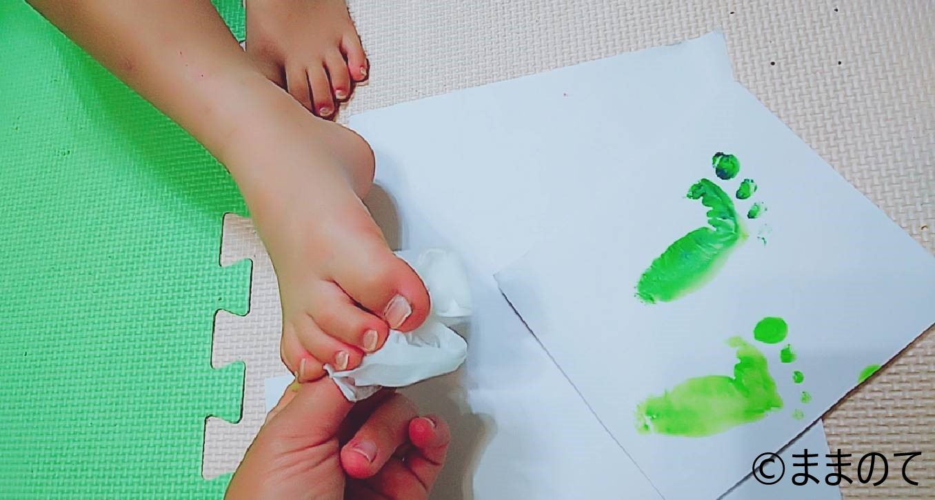 手形・足型をとったら、すぐに絵の具やインクを拭きとりましょう。子どもが絵の具を口に入れたり動き回って部屋を汚したりするかもしれません。まずは事前に用意しておいた濡れタオルで軽く拭いてから、洗面所できれいに洗っても良いですね。