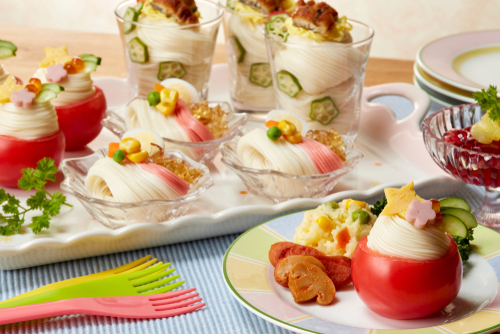 さらに、盛り付けたそれぞれのそうめんに、カットしたオクラや星型に切り抜いたハム、錦糸卵や千切りきゅうりなど、それぞれ別々に具材を乗せると彩りも華やかになりますよ。