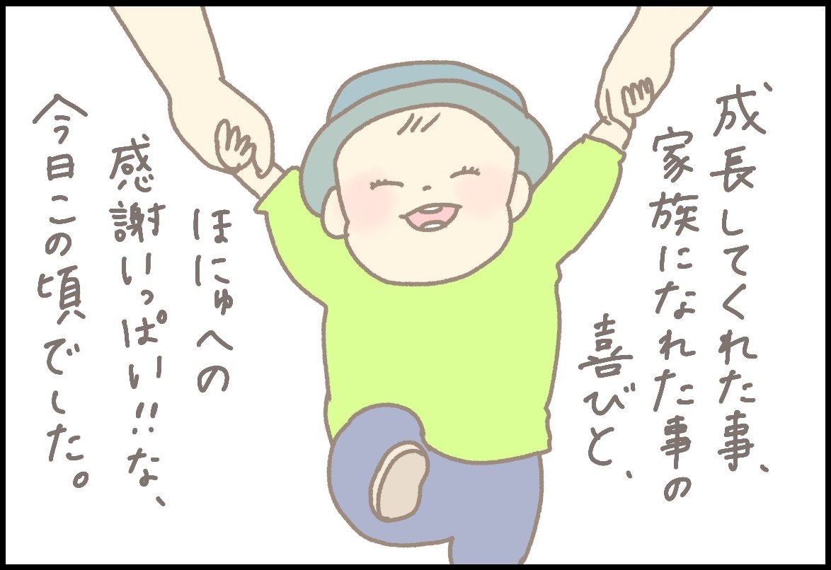 たっちやおさんぽなど、いろいろなことができるようになってきた、ほにゅくん。ふとした瞬間にあふれでる「ありがとう」も、宝物ですね。(編集部)