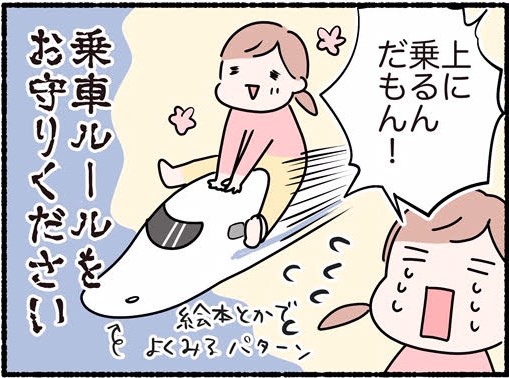 娘は絵本とかお人形遊びでするように、自転車のようにまたがって新幹線に乗ると思っていたみたいです!
