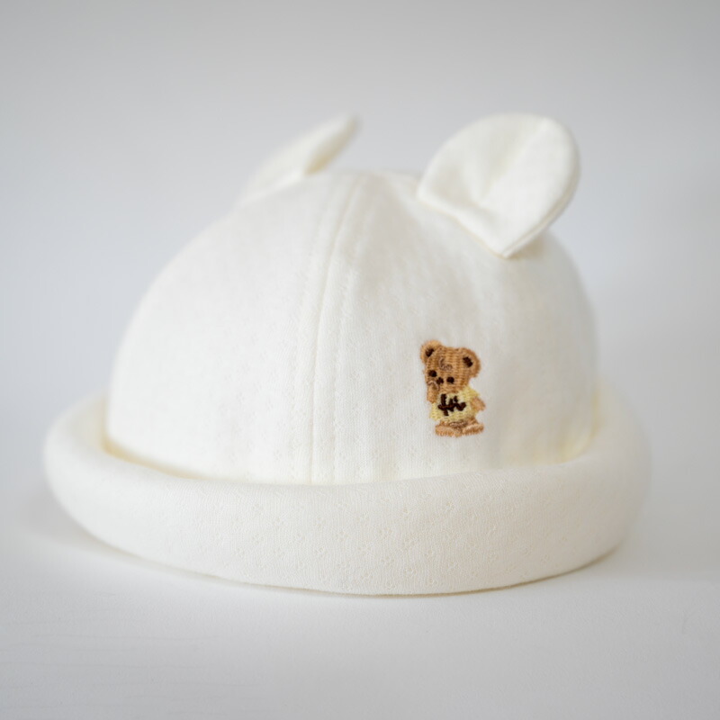 新生児の赤ちゃんの頭を優しく守る、柔らかい素材のベビーハットです。くまなどの耳付きデザインは赤ちゃんをよりかわいらしく見せてくれるでしょう。首元を日差しから守る日よけ付きで、屋外でも安心して使えます。あごゴム付きでなくしにくいのもうれしいですね。