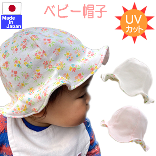 無地メッシュと小花柄のリバーシブルで使えるチューリップハットです。UVカット率は96%以上、遮熱性のある素材を使い夏の暑い日差しから赤ちゃんを守ります。生地が柔らかく、ていねいな縫製が好評です。