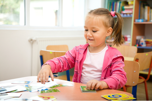 Dクラスは、2歳から3歳向けのコースです。キッズアカデミーでは、コースごとに異なる教材を使用しますが、Dクラスではひも通しやカードを使って考える力を育みます。