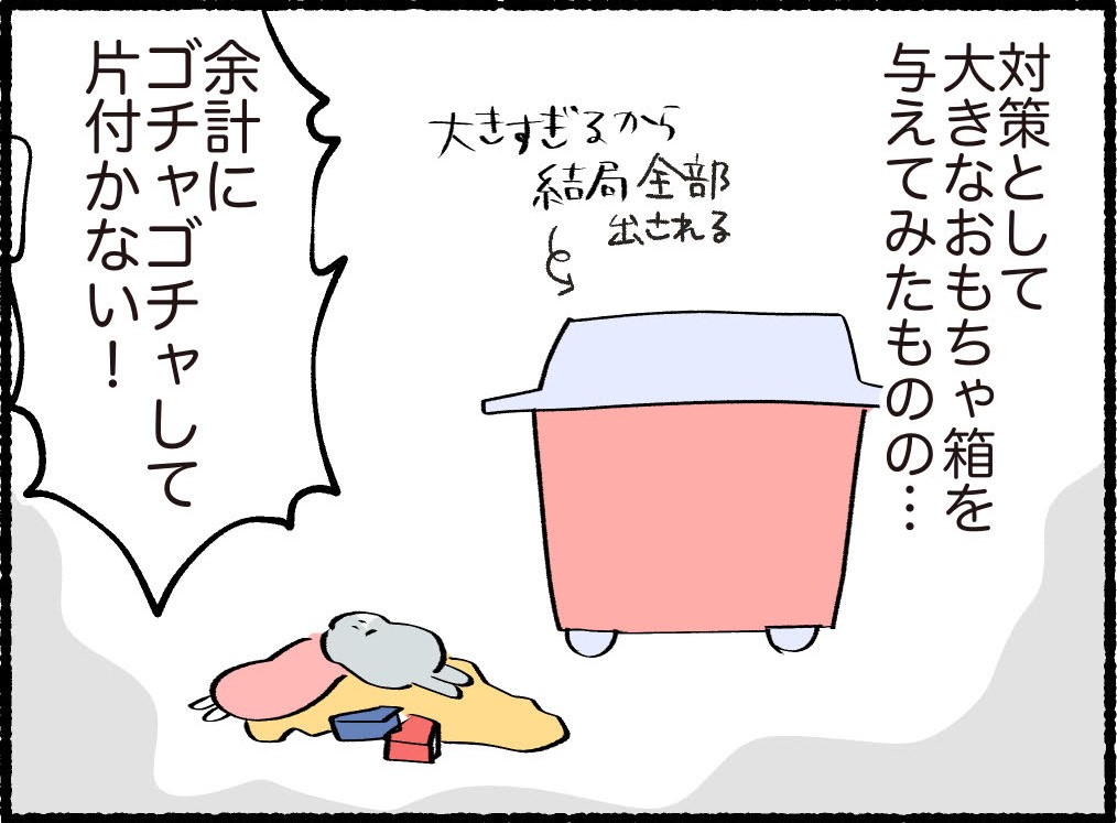 片付けがめんどくさくならないようにと、大きめのおもちゃ箱を買って「ここに全部入れればOK作戦」に出ましたが、おもちゃを出すときお目当ての物が見つからないから全部ひっくり返すようになり、余計に大惨事。