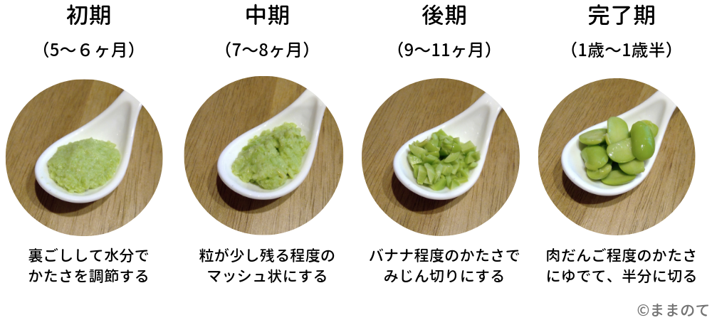 枝豆はゆでてもやわらかくなりにくく、大豆アレルギーの心配もあるため、離乳食中期以降に使うのがおすすめです。離乳食初期からしっかりとペーストにすれば与えて良いという意見がありますが、できれば離乳食後期に入る9ヶ月以降に食べさせましょう。形やかたさの目安は以下のとおりです。