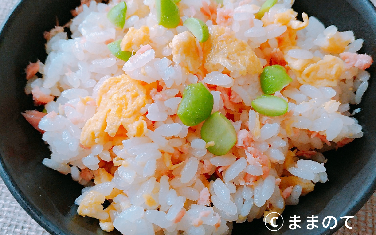 4.卵がある程度かたまったら、軟飯と枝豆、鮭を加えて炒める