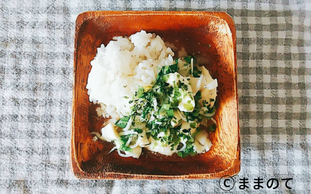 3.粗熱を取り、かつおぶしをひとつまみかける(あらめのかつおぶしは指先で砕きながらかける)