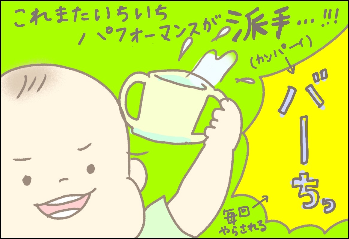 「ぷあー!!」と元気よくコップで飲むほにゅくん。保育園で練習したことをママに見せることができて、とっても嬉しそうですね!(編集部)