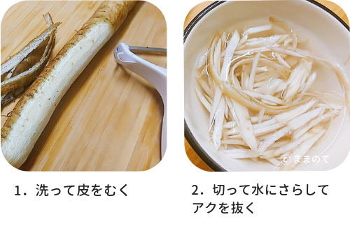 1.ごぼうは洗って皮をむき、薄く切ってアク抜きをする