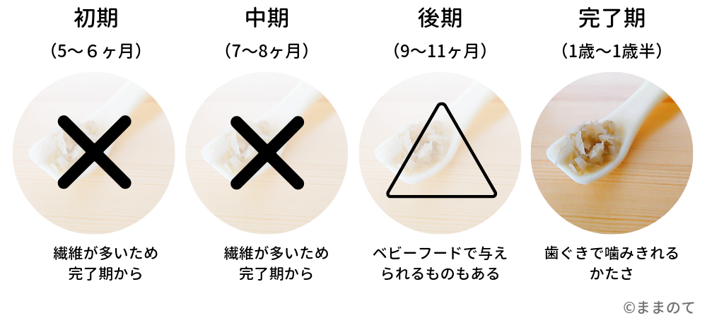 | 後期 (9~11ヶ月頃) △ | ・ベビーフードでは食べられるものもある。 ・調理して与えるときはあくをしっかり抜き、十分に柔らかくする。 |