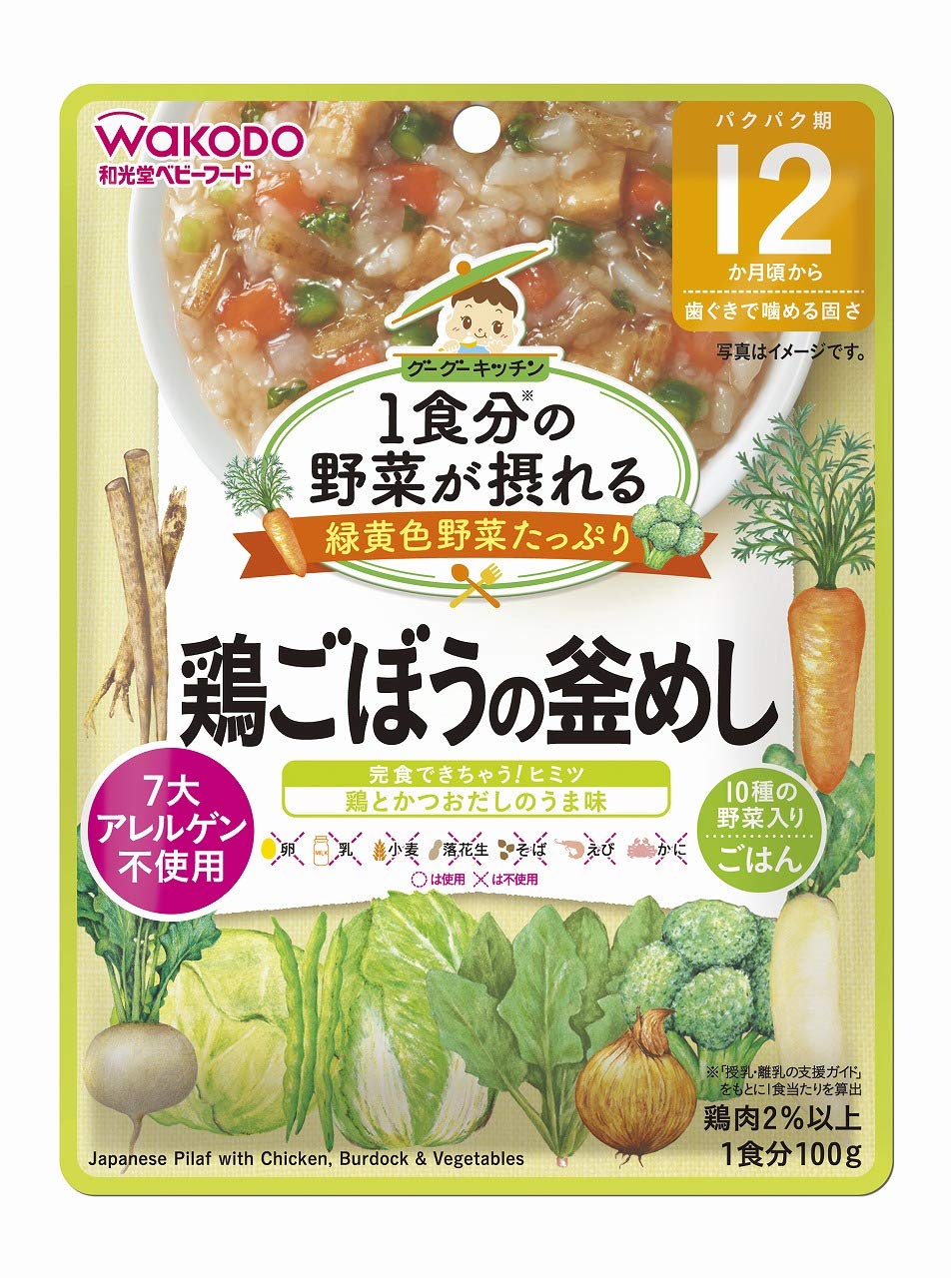 和光堂の「鶏ごぼうの釜めし」は1袋で1食分の野菜が摂れるベビーフードです。ごぼう以外にも人参や大根、ブロッコリーやキャベツなどが含まれ、かぶや白菜などの野菜ピューレも使われています。