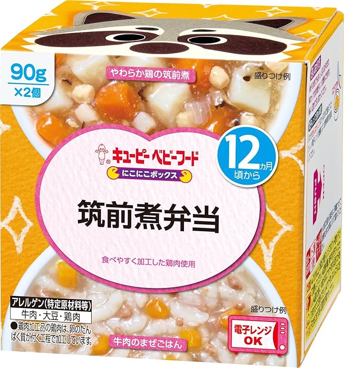 キユーピーから発売されている「筑前煮弁当」です。ごぼうも鶏肉を柔らかく煮込んだ筑前煮と牛肉とごぼうの風味が香るまぜご飯がセットになっています。生後12ヶ月頃の離乳食完了期から赤ちゃんに食べさせてあげられます。