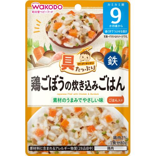 和光堂のレトルトパウチのベビーフード、グーグーキッチンシリーズから発売されている「鶏ごぼうの炊き込みごはん」です。